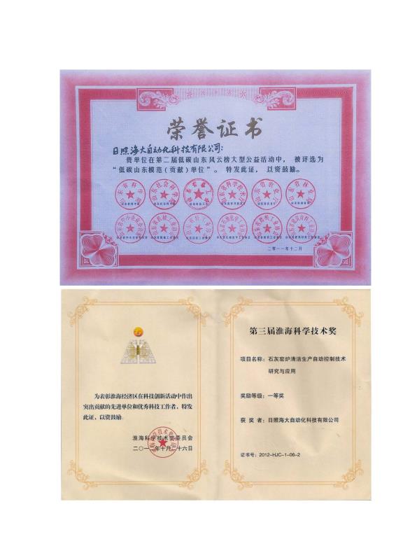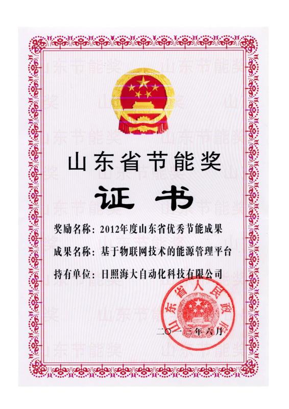 公司自主研發(fā)的“基于物聯(lián)網(wǎng)技術的綜合生產(chǎn)效率提升系統(tǒng)(OEE)”和“基于物聯(lián)網(wǎng)技術的能源管理系統(tǒng)”分別被評為“2014年度日照市科技進步一等獎”、“2013年日照市科技進步二等獎”,同時該成果也被評為“山東省優(yōu)秀節(jié)能成果獎”(魯政辦發(fā)〔2006〕116號)。公司自主研發(fā)的《石灰窯爐清潔生產(chǎn)自動控制技術研究與應用》獲得2010年度日照市科學技術進步獎二等獎,我公司2010年實施的《山東五征集團有限公司風機、水泵、空壓機系統(tǒng)節(jié)能項目》被歐盟SWITCH ASIA項目、中國節(jié)能協(xié)會節(jié)能服務產(chǎn)業(yè)委員會、中國標準化研究院評為“中國電機系統(tǒng)節(jié)能優(yōu)秀項目”。