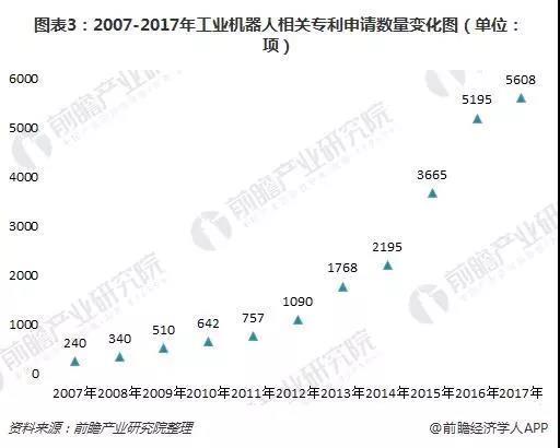 從申請(qǐng)專利數(shù)量來看,2007-2017年,我國工業(yè)機(jī)器人專利申請(qǐng)數(shù)量總體上呈上升的趨勢(shì)。2014-2016三年間,專利申請(qǐng)數(shù)量大幅增多;到2017年,工業(yè)機(jī)器人專利申請(qǐng)數(shù)量達(dá)到5608項(xiàng)。