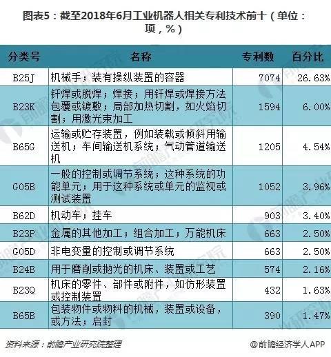 截至2018年6月,從我國工業(yè)機(jī)器人專利技術(shù)構(gòu)成來看,B25J(機(jī)械手;裝有操縱裝置的容器)專利申請(qǐng)數(shù)量排名第一,為7074項(xiàng),占比達(dá)到26.63%;B23K(釬焊或脫焊;焊接;用釬焊或焊接方法包覆或鍍敷;局部加熱切割,如火焰切割;用激光束加工)專利申請(qǐng)數(shù)排名第二,專利數(shù)量為1594項(xiàng),占比為6.00%;其余技術(shù)占比均在5%以下。